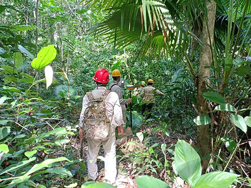 該項(xiàng)目是印尼公司今年首個(gè)探礦項(xiàng)目,大部分鉆孔位于原始森林地區(qū),勘探線路總長(zhǎng)9公里,無進(jìn)場(chǎng)道路,施工難度較大。項(xiàng)目部發(fā)揚(yáng)“逢山開路、遇水搭橋”的奮斗精神,敢于擔(dān)當(dāng),攻堅(jiān)克難,用心用力解決森林放孔、鉆機(jī)用水、交通等難題。因施工現(xiàn)場(chǎng)地形起伏較大,山林中溝谷縱橫,樹林茂密,采用全站儀效率極低,GPS信號(hào)時(shí)有時(shí)無。項(xiàng)目部決定先讓工人用砍刀修出小道,然后攜帶GPS等測(cè)量設(shè)備進(jìn)入森林地區(qū),測(cè)放出大致孔位后安排挖機(jī)修路,最后再精確定位。印尼當(dāng)?shù)貧夂蚋邷匮谉幔种形孟x肆虐,密不透風(fēng),手機(jī)無信號(hào),時(shí)不時(shí)還有小動(dòng)物出沒,踏勘人員需要時(shí)時(shí)刻刻提高警惕,這對(duì)踏勘組人員體能及意志力是一個(gè)極大的考驗(yàn)。為了提高工作效率,項(xiàng)目人員攜帶干糧進(jìn)山,中午稍作休息補(bǔ)充能量,便繼續(xù)向森林深處進(jìn)發(fā)。每到達(dá)一個(gè)新的孔位,對(duì)于踏勘人員來說就是一次勝利。由于現(xiàn)場(chǎng)踏勘時(shí)沒有在森林中找到水源。通過跟業(yè)主協(xié)商,從最近的供水管道引水,鉆孔間直線距離大于200米,單線最大供水長(zhǎng)度約3.5公里。項(xiàng)目部便采用方桶裝滿水后,讓挖機(jī)一桶一桶吊進(jìn)去,或從路邊挖水坑,用抽水泵一站一站倒過去。項(xiàng)目人員上下班時(shí),皮卡車僅能將他們送到山腳下,剩下的路程只能靠他們徒步前行,他們卻從未喊過苦、叫過累。