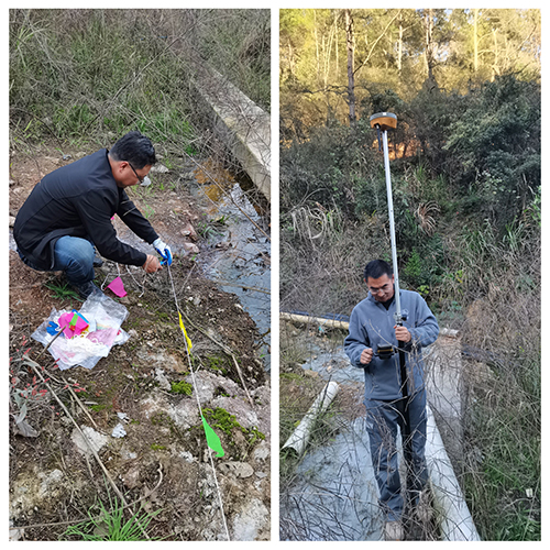 項目駐地氣候濕潤多雨,場地濕滑崎嶇,遍地都是灌木叢,對前期測量放線和圈地工作的開展十分不利。然而項目部人員無所畏懼,奮勇向前,充分發(fā)揮“地質(zhì)三光榮”精神,積極踐行國家“兩山”理念,將生態(tài)文明治理的使命融合成地質(zhì)人的信念,縱使泥濘滿身、荊棘刺背,帷幕線所指,我亦所往。