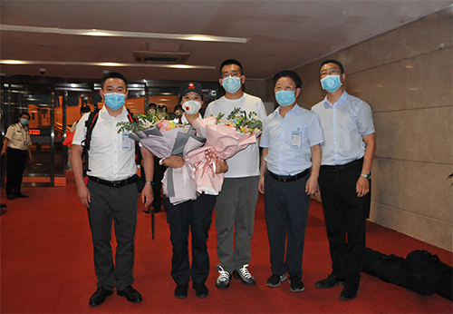 儀式結(jié)束后,在鮮花和掌聲中,隊員們?nèi)胭F賓候機(jī)室,黨委書記劉喜鵬代表黨委及全隊職工獻(xiàn)上鮮花,并歡迎何亞靜同志回家。在經(jīng)歷了四十多天的分離后,何亞靜同志終于迎來了與家人團(tuán)聚的時刻,并與前來接機(jī)的家屬緊緊相擁。