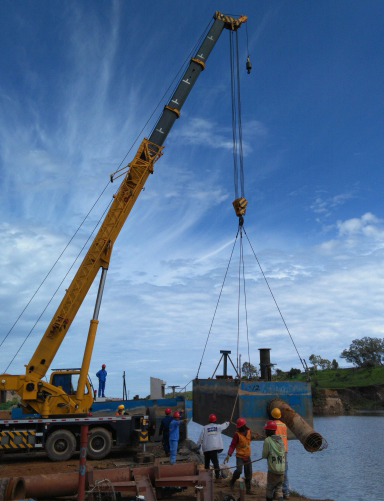 該項(xiàng)目合同于2015年12月25日 簽訂,合同簽訂后,剛果(金)公司積極籌備,雖適逢雨季,道路泥濘給運(yùn)輸帶來(lái)很大影響,但經(jīng)過(guò)近十天的不懈努力,兩艘浮船(包括2個(gè)主浮箱、4個(gè)副浮箱)、三個(gè)箱變及部分膠管、浮子等主要物資全部運(yùn)至現(xiàn)場(chǎng)。